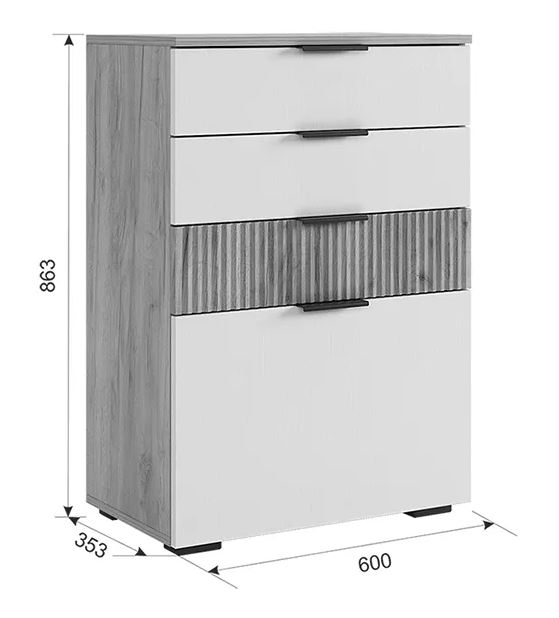 Комод "Бери" - модный и стильный предмет мебели, который представляет собой функциональное и практичное решение для разных помещений. Состоящий из трех вместительных ящиков и нижней откидной барной секции, комод "Бери" отличается компактными размерами (350 мм глубины), при этом обладая достаточным объемом для хранения различных предметов. Комод может быть удачным дополнением для гостиной, спальни, прихожей, детской комнаты или кабинета. Особым акцентом комода является фасад ящика из МДФ с вертикальной фрезеровкой "Вельвет".