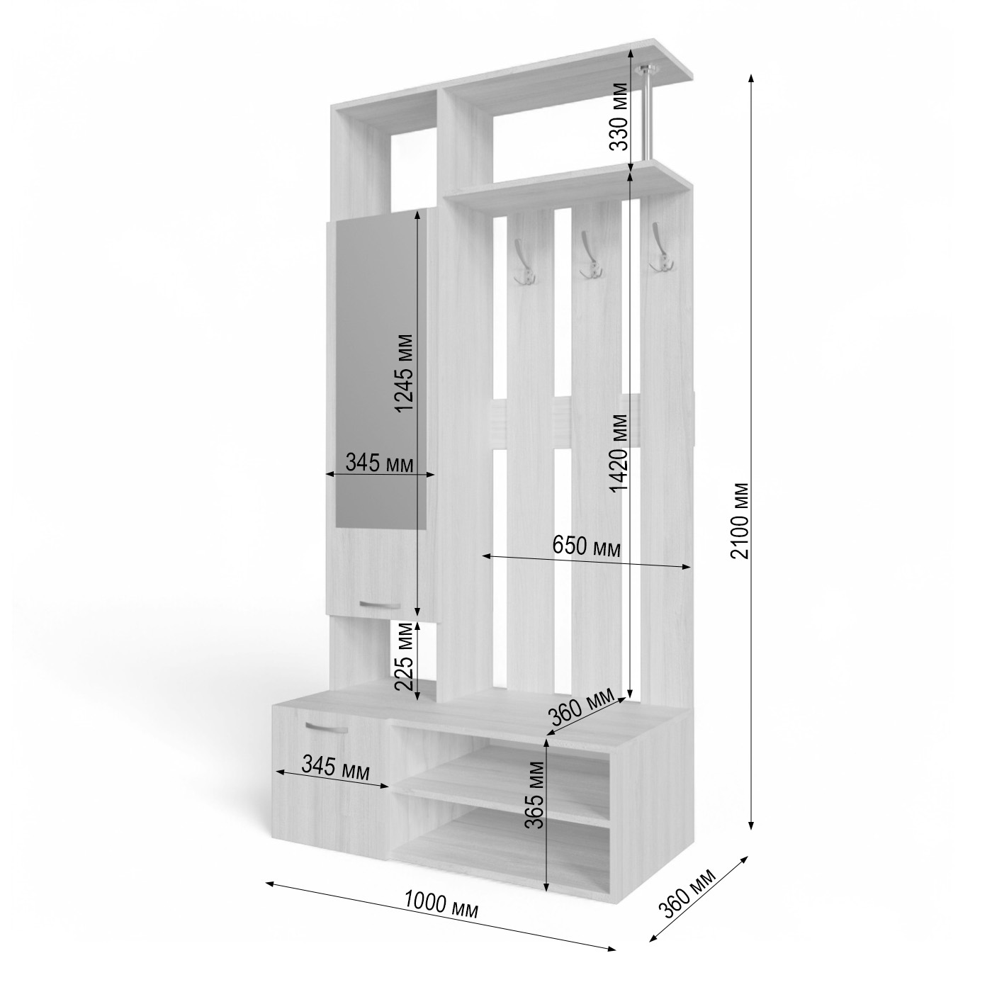 · Открытые полки (нижние для обуви, верхние для аксессуаров).
