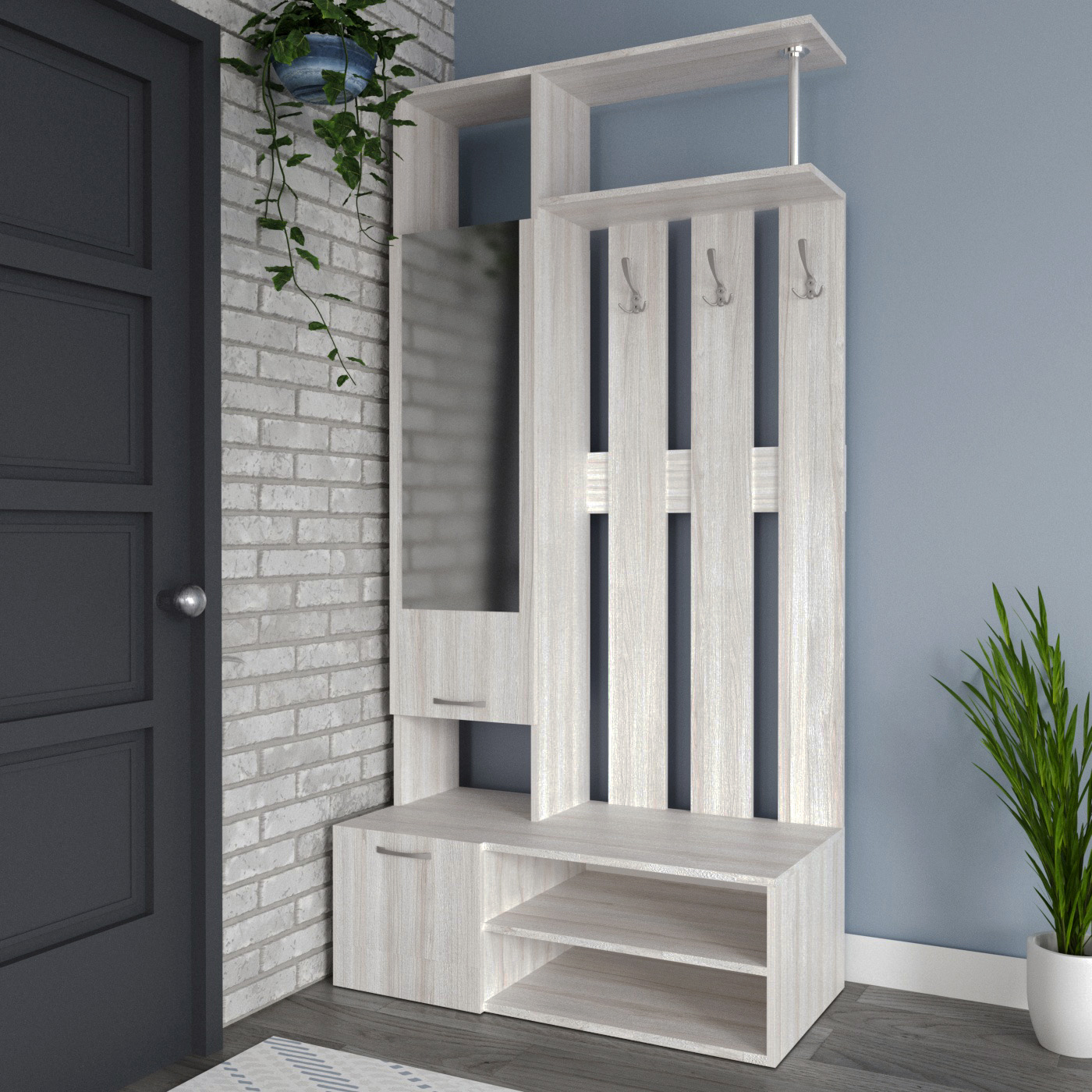 Организуйте пространство у входа с помощью практичной прихожей "БН-208". Модель предлагает полный набор для хранения, сочетая закрытые и открытые решения.